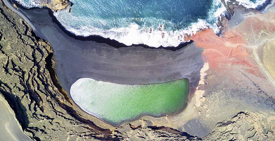 Trotz moderner Appartementanlagen spürt ihr diesen Charme bis heute – El Golfo ist ideal, um richtig zu entspannen. Doch berühmt ist das Dorf besonders für den Charco de los Clicos, den „grünen See“, der zu den schönsten Lanzarote Sehenswürdigkeiten zählt. Nach Vulkanausbrüchen im 18. Jahrhundert bildete sich hinter dem heutigen Strand Playa el golfo eine mit Meerwasser gefüllte Lagune, deren Wasser aufgrund der hohen Algenkonzentration smaragdgrün zu leuchten scheint.