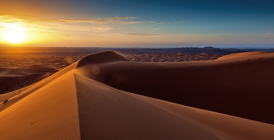 Ein Meer an goldenen Sanddünen, die auch am Horizont nicht zu enden scheinen und sich bis zu 200 Meter hoch in den strahlend blauen Himmel strecken: Was der Wind in der Erg Chebbi, dem größten Dünengebiet Marokkos, erschaffen hat, ist nicht nur eine der Top-Attraktionen des Königreiches, sondern lässt euch sicherlich voller Ehrfurcht zurück. Wandert zu Fuß durch diese atemberaubende Naturlandschaft, düst mit dem Quad oder dem Geländewagen über den Sand oder lasst euch ganz traditionell auf dem Rücken eines Kamels schaukeln.