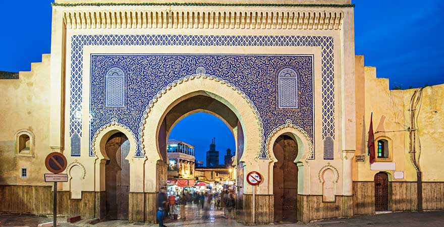 Der Besuch der ältesten der vier marokkanischen Königsstädte fühlt sich an wie eine Reise in das vergangene Leben des Orients – vor allem in der Medina Fès el Bali. Habt ihr die größte Altstadt Nordafrikas, die seit 1981 zum UNESCO-Welterbe zählt, durch das reich verzierte blaue Stadttor Bab Bou Jeloud (das sich von innen plötzlich grün zeigt) betreten, fühlt ihr euch bei all den Sehenswürdigkeiten wie in einem großen Freilichtmuseum.