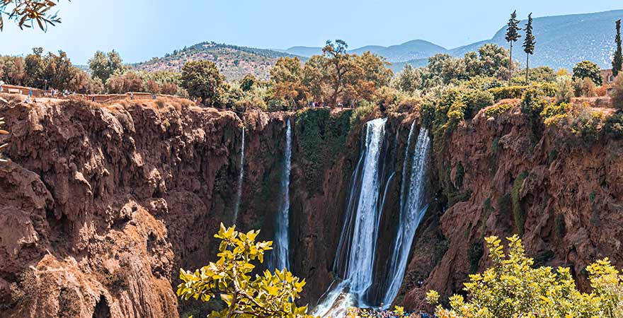 Dass auch die Natur Marokkos nicht mit Sehenswürdigkeiten geizt, zeigen die unterschiedlichen Landschaften des Atlasgebirges auf imposante Weise. Ganz im Norden präsentiert sich das grüne Rif-Gebirge mit steil ins Meer abfallenden Klippen, die malerische Badebuchten umrahmen sowie mit idyllischen Bergdörfern und Städten, wie der entspannten „Blauen Stadt“ Chefchaouen. Der Mittlere Atlas bietet euch Erholung pur: In glasklaren Seen könnt ihr zwischen Zedern baden, in den abgeschiedenen Landschaften der bis zu 2.000 Meter hohen Berge wandern und im Winter sogar Ski fahren. Sucht ihr beim Wandern die Herausforderung, ist der nördliche Hohe Atlas mit dem Jebel Toubkal, dem mit 4.168 Metern höchsten Gipfel des Landes, euer Highlight. Traditionelle Bergdörfer versetzen euch in das marokkanische Leben von vor 100 Jahren und die berühmten Ouzoud Wasserfälle sind ein rauschendes Spektakel.