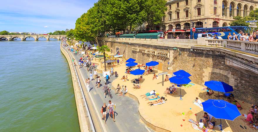 Am Stadtstrand am Seine-Ufer könnt ihr euch herrlich entspannen Tagsüber lohnt es sich aber auch an der höher gelegenen Straße auf dem Trottoir zu schlendern und die vielen Stände der „Bouquinistes“ zu durchstöbern. Die haben in ihren Holzverschlägen so manche Bücherrarität anzubieten. Das Seineufer ist am Abend übrigens nicht nur bei den Einheimischen beliebt. Schnappt euch ein leckeres belegtes Baguette und eine Flasche Wein und genießt laue Sommerabende bei einem romantischen Picknick am Wasser. Um euch herum sitzen dann Gruppen aus Touristen und Einheimischen und irgendjemand hat immer eine Gitarre dabei und sorgt für die passende Hintergrundmusik.