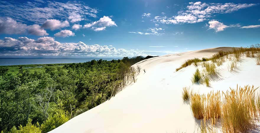 Der schmucke kleine Badeort ist umgeben vom Slowinzischen Nationalpark, dessen Dünenlandschaften bereits seit 1977 UNESCO-Biosphärenreservat sind. Diese Naturschönheit ist Fluch und Segen für den Ort, denn einerseits nagt die Ostsee am Strand, während vor allem im Winter die Wanderdünen immer näherkommen. Besonders eindrucksvoll zeigt sich das an der Lontzkedüne, die mit 42 Metern zu den höchsten Dünen Europas gehört. Malerisch ist auch der Rest der Umgebung. Der Lebsko-See beeindruckt mit seiner vielfältigen Flora und Fauna, während ihr auf dem Sarbsko-See ein hervorragendes Kite-Revier findet.