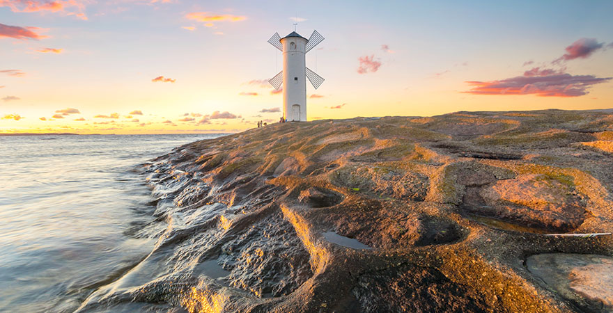 Swinemünde (Świnoujście) liegt auf drei Inseln, wobei der größte Teil direkt an der deutschen Grenze auf Usedom zu finden ist. Auf der insgesamt ca. zwölf Kilometer langen Strandpromenade könnt ihr von hier bis zu den Kaiserbädern auf der deutschen Seite flanieren. Allerdings wird der polnische Teil auf weiten Strecken durch einen Kiefernwald vom Strand getrennt. Direkt am Meer liegt das Kurviertel mit prächtigen Villen und vielen Hotels.
