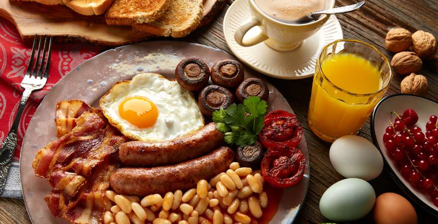 Das mehrgängige Frühstück versorgt euch für lange Zeit mit Vitaminen, Proteinen und Kohlehydraten. Ursprünglich als Energiedepot für die hart arbeitende Bevölkerung gedacht, findet das englische Frühstück auch bei Urlaubern mit ausgedehntem Sightseeing-Programm und bei Sparfüchsen mit Halbpension großen Anklang.
