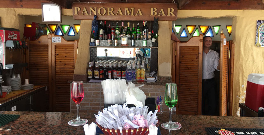Von der Lobby Richtung Strand gelangt ihr an die Siesta-Bar mit herrlichem Ausblick von der Anhöhe über das Meer, bis hin zur gegenüberliegenden Insel. Die Fayrouz-Bar hat ab 10 Uhr morgens geöffnet. Das All Inclusive gilt bis Mitternacht, und natürlich auch im Theater hinter der Lobby, das erst abends geöffnet wird.