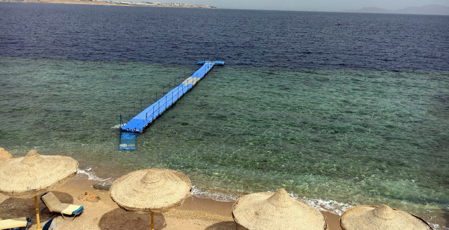 [otw_shortcode_info_box border_type=“bordered“ border_color_class=“otw-orange-border“ border_style=“bordered“]Tipp: Weitere kleine Strandpavillons, die VIP-Lounges, befinden sich oberhalb des Meereszugangs. Hier hat man einen Blick aufs Meer von einer kleinen Anhöhe, muss aber zum Baden die Treppen hinabsteigen. Die Lounges werden wochenweise gegen eine Gebühr von 25 Euro vermietet.[/otw_shortcode_info_box] [otw_shortcode_info_box border_type=“bordered“ border_color_class=“otw-orange-border“ border_style=“bordered“]Hinweis: Es ist verboten, auf den Riffen zu gehen oder zu stehen. Deshalb bitte immer den Steg benutzen und unbedingt Badeschuhe anziehen.[/otw_shortcode_info_box]Links davon befindet sich der olympische Pool, der auch der Ruhepool ist, ohne Animation oder Musik. Dieser Pool hat den Namen wegen der olympischen Form, hier kann man seine Bahnen ziehen. Viele Schattenplätze sind möglich, da große Pergolas mit Dach rund um den Pool gebaut wurden. Das ist praktisch, denn unter der ägyptischen Sonne braucht ihr neben einem hohen Sonnenschutzfaktor auch Schatten. Wer Sonne möchte, zieht seine Liege einfach etwas vor.