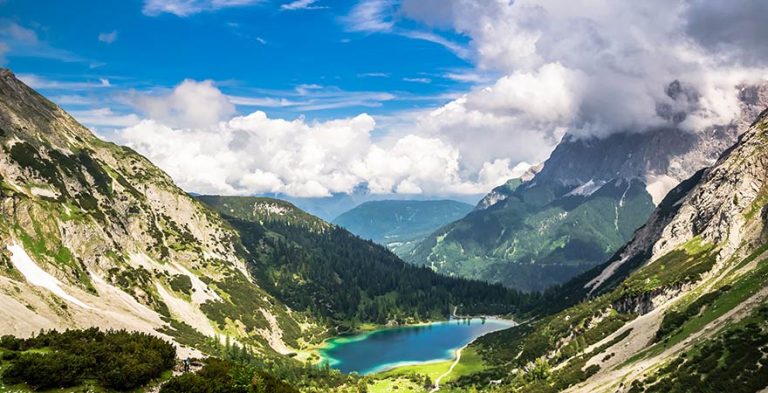 Ein Bergsee, wie er im Buche steht: Der Drachensee bei Ehrwald in Tirol erfüllt alle Voraussetzungen, um als einer der schönsten Alpenseen zu gelten. Er ist smaragdgrün, eiskalt und umgeben von den Gipfeln der Mieminger Kette. Für diese Aussicht – inklusive Blick auf das Zugspitzmassiv – lohnt sich auch der rund 2,5 Stunden lange Fußmarsch von der Bergstation Ehrwalder Alm.