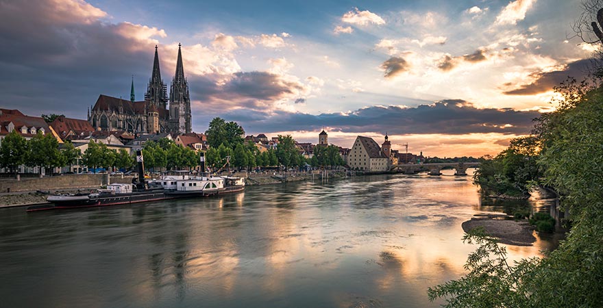 Regensburg ist eine der ältesten und schönsten Städte Deutschlands und wurde vor fast 2.000 Jahren von den Römern gegründet. Im 6. Jahrhundert war Regensburg sogar mal die bayrische Hauptstadt. Die Altstadt mit über 1.000 denkmalgeschützten Gebäuden steht natürlich auf der Liste des UENSCO Weltkulturerbes, ist aber dennoch ein sehr lebendiges Zentrum mit vielen Geschäften, Cafés und Restaurants. Dominiert wird das mittelalterliche Ensemble vom prächtigen Dom, in dem die berühmten Domspatzen zu Hause sind.