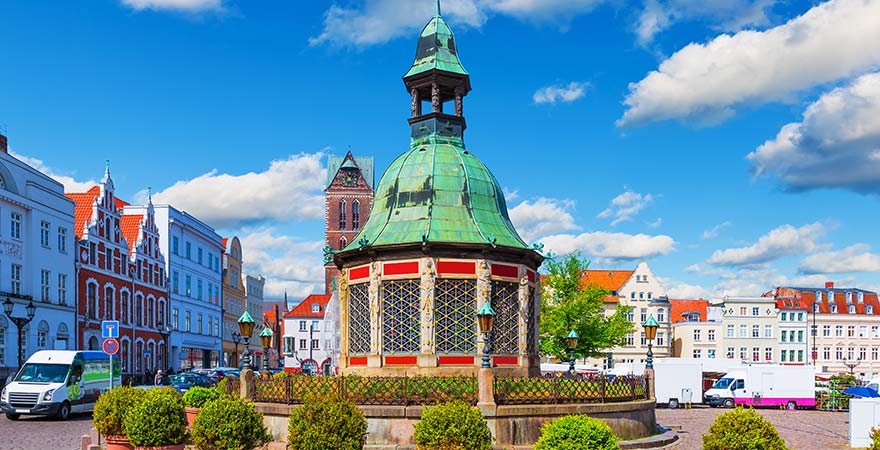 Mit Wismar hat es noch eine weitere Hansestadt auf die Liste unserer schönsten Städte Deutschlands geschafft. Die historische Altstadt gehört zu den am besten erhaltenen mittelalterlichen Stadtkernen in Deutschland. Im Zentrum des Marktplatzes findet ihr die Wasserkunst, das Wahrzeichen der Stadt, das früher zur Trinkwasserversorgung der Bürger genutzt wurde. Direkt daneben steht das Haus „Alter Schwede“ mit seiner spätgotischen Giebelhausfassade.
