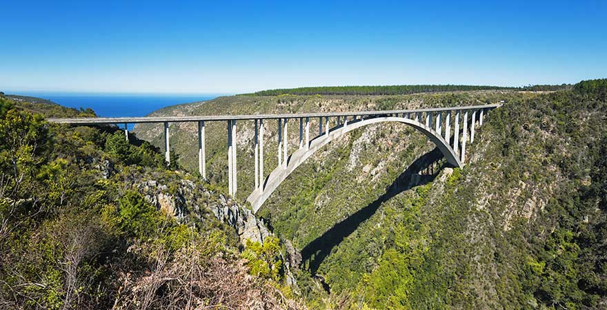 Unsere nächste Station führt uns nach Südafrika, wo die Garden Route eines der großen touristischen Highlights des Landes darstellt. Die Straße ist ein Teil der Autobahn National Route 2 und verdankt ihren Namen dem Garten Eden. Dem biblischen Vorbild entsprechend ist die Natur entlang der 369 Kilometer langen Straße zwischen Gqeberha (bis 2021 Port Elizabeth) und Mossel Bay: Hier könnt ihr endlose grüne Buschlandschaften ebenso bestaunen wie spektakuläre Schluchten oder rustikale Gesteinsformationen. Architektonische Highlights der Garden Route sind die Paul Sauer Bridge und die Bloukrans Bridge, die mit 216 Metern die höchste Brücke des Kontinents ist.