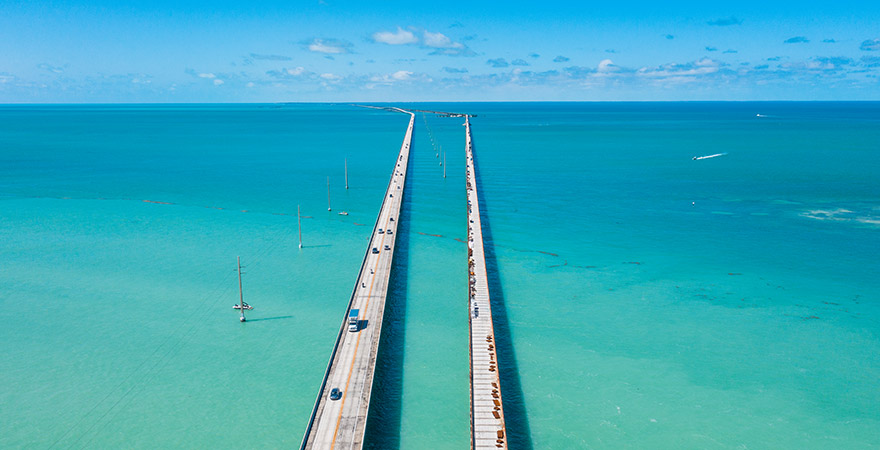 Unsere Reise zu den schönsten Straßen der Welt führt uns über den Atlantik in die Vereinigten Staaten von Amerika. Hier liegt südwestlich des US-Staats Florida die Inselkette der Florida Keys, die aus über 200 Koralleninseln besteht und mit zahlreichen Brücken des sogenannten „Overseas Highway“ miteinander und mit dem Festland verbunden sind. Die bekannteste dieser Brücken ist die Seven Mile Bridge, welche Vaca Key und Bahia Honde verbindet – der Name des 1982 eröffneten Bauwerks ist dabei etwas verwirrend, denn die Brücke ist „nur“ 6,79 Meilen (fast 11 Kilometer) lang.