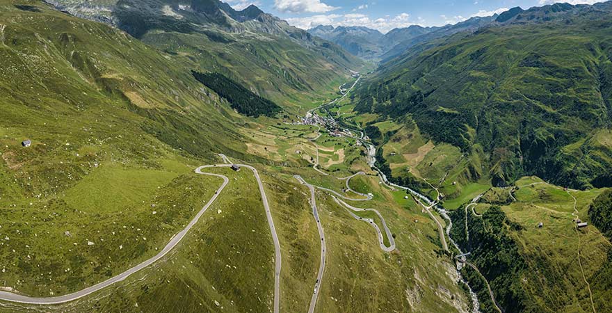 Apropos Bond James Bond: Auch zu unserer nächsten Station der schönsten Straßen der Welt hat der fiktive Geheimagent einen Bezug. Wenn ihr in den Schweizer Alpen unterwegs seid, solltet ihr es euch nicht nehmen lassen, den Furkapass zu befahren, den Sean Connery als Bond im Film „Goldfinger“ (1964) in einer wilden Verfolgungsjagd herabsauste. Auf einer Höhe von 2500 Metern führt die Straße kurvenreich und geschwungen vom Kanton Wallis in das Hochgebirge des Kantons Uri und offenbart euch schweizerische Alpen-Romantik vom Feinsten: Freut euch auf schneebedeckte Gipfel, steile Felswände, grüne Hänge, tiefe Wälder und zahlreiche Fotospots!