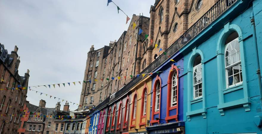 Bunte Fassaden erhellen das Stadtbild im häufig bewölkten Edinburgh