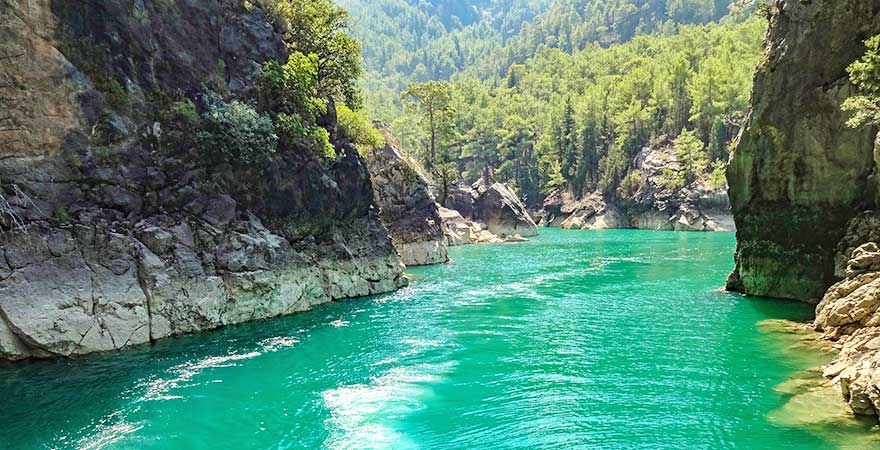 Spätestens dann werdet ihr mit Blick auf den riesigen Stausee verstehen, warum dieser Ort auch „Grüner Canyon“ genannt wird. Das Wasser schimmert fast schon surreal Grün. Wenn ihr ein wenig Zeit habt, könnt ihr auch eine Schifffahrt auf dem See machen. Vergesst dafür nicht eure Badesachen, da die Boote auch einen Stopp einlegen, damit ihr in das kühle Nass springen könnt. Unmittelbar südlich der Staumauer fließt das Wasser in einer fjordartigen Landschaft talwärts – auch hier könnt ihr euch mit einem Sprung ins kühle Nass erfrischen, wandernd die Natur erkunden, Tretboot fahren oder in einem der zahlreichen türkischen Restaurants mit Seeblick schlemmen.