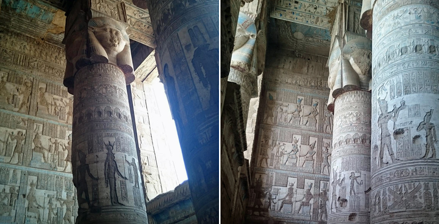 Natürlich gibt es auch geschichtliche Besonderheiten: Zum Beispiel haben die Säulenkapitelle nicht wie bei den meisten Tempeln die Form von Lotusknospen oder Papyrusblättern, sondern stellen riesige Köpfe der Kuhgöttin dar – ein Symbol der Göttin Hathor.