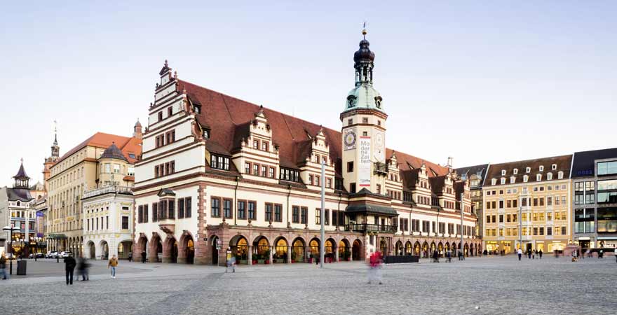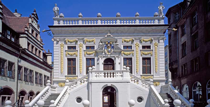 Vom Naschmarkt geht ihr durch eine Arkade des Alten Rathauses, das 1556 errichtet wurde. Seit 1909 ist hier ein interessantes Museum zur Stadtgeschichte untergebracht. Im Rahmen einer Führung könnt ihr den 53 Meter langen Festsaal bewundern, in dem heute vor allem Konzert- und Kulturveranstaltungen stattfinden. Hervorzuheben ist ferner das 25 Quadratmeter große Stadtmodell, welches maßstabsgetreu Leipzig im 19. Jahrhundert zeigt.
