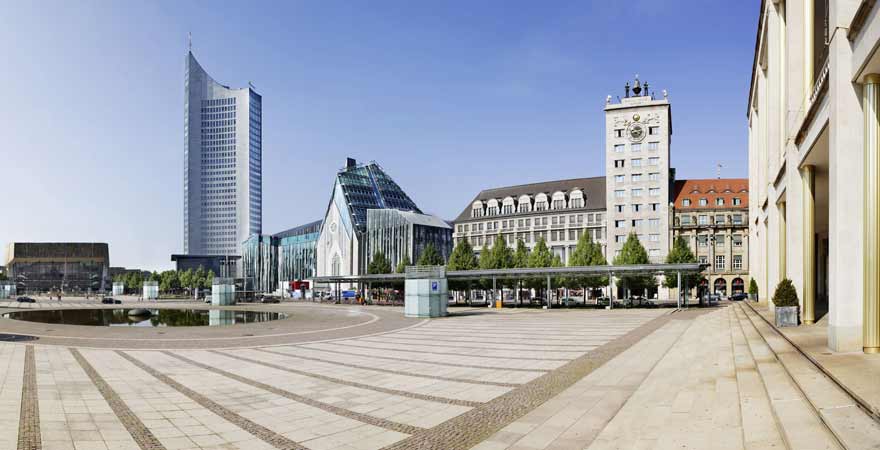 Sehenswürdigkeiten am Platz sind die Oper, das Gewandhaus, das Paulinum, der Mendebrunnen sowie die Demokratieglocke. Das Kontrastprogramm zu den alten Gebäuden bildet das City-Hochhaus. Mit einer Höhe von 142,5 Metern ist es ein markantes Wahrzeichen Leipzigs. Es ist zwischen den Jahren 1968 und 1972 erbaut worden und beherbergt heute diverse Büros und eine Aussichtsplattform. Gegen einen kleinen Geldbetrag könnt ihr von dort eine spektakuläre Aussicht auf die Großstadt genießen.