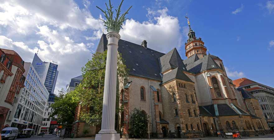 Wenn ihr die Sehenswürdigkeiten rund um diesen Platz erkundet habt, ist es nur ein kurzer Weg zu unserem nächsten Stopp. Im Jahr 1165 erhielt Leipzig das Markt- und Stadtrecht. Dies ist zum Anlass genommen worden, um die Nikolaikirche zu errichten. Sie ist 63 Meter lang und 43 Meter breit, was sie zur größten Kirche der Großstadt macht.
