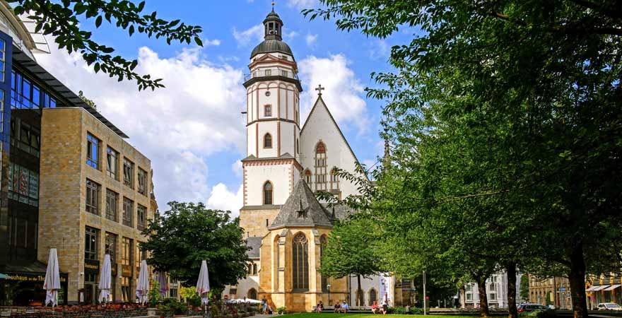 Ihr überquert nun den Marktplatz und erreicht bald das nächste Highlight, die Thomaskirche. Die spätgotische Hallenkirche aus dem ausgehenden 15. Jahrhundert ist Sitz eines der ältesten Knabenchöre der Welt. Seit über 800 Jahren zählt er wie das Gewandhausorchester zu den wichtigsten kulturellen Institutionen der Stadt. Der bekannteste Kantor war Johann Sebastian Bach, dem die Orgel im Inneren der Kirche gewidmet wurde. Viele von euch kennen sicher die Popgruppe „Die Prinzen“. Vier der fünf Bandmitglieder waren aktiv im Thomanerchor.
