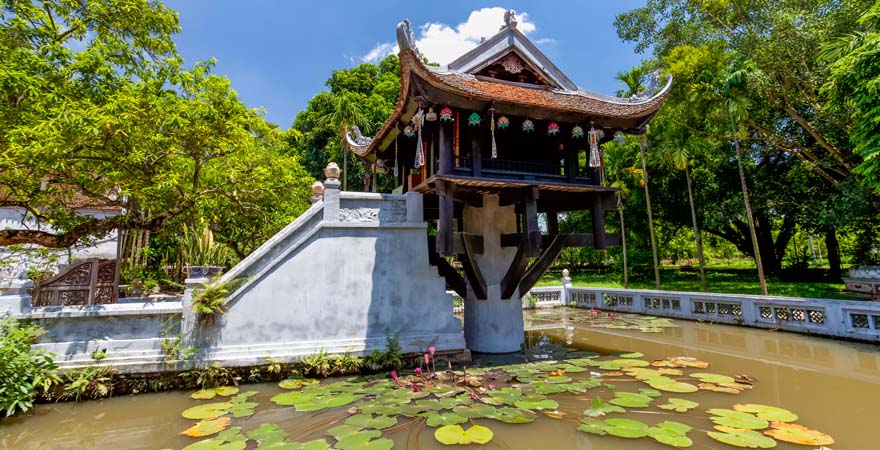 Als eine der auch unter den Einheimischen beliebtesten Vietnam Sehenswürdigkeiten erhebt sich die wahrscheinlich im Jahr 1049 im Auftrag des vietnamesischen Königs Lý Thái Tông erbaute eindrucksvolle Einsäulenpagode in Form einer Lotusblume vor einem Teich, dessen Oberfläche passenderweise von Lotusblumen geziert wird. Einst auf einem Baumstamm errichtet, im Jahr 1954 allerdings während des Französischen Indochinakriegs zerstört, steht sie heute auf einer Betonsäule, hat jedoch nichts von ihrem Zauber eingebüßt.