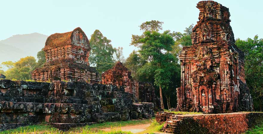 Majestätische, meisterhaft verzierte Tempelruinen, die von Farnen und Moos überwuchert werden, rundum vietnamesischer Dschungel und im Hintergrund zerklüftete Bergketten: Die der hinduistischen Gottheit Shiva geweihte Tempelstadt My Son versprüht eine unvergleichliche Aura, die sie zweifelslos zu einer der mystischsten Sehenswürdigkeiten Vietnams macht.