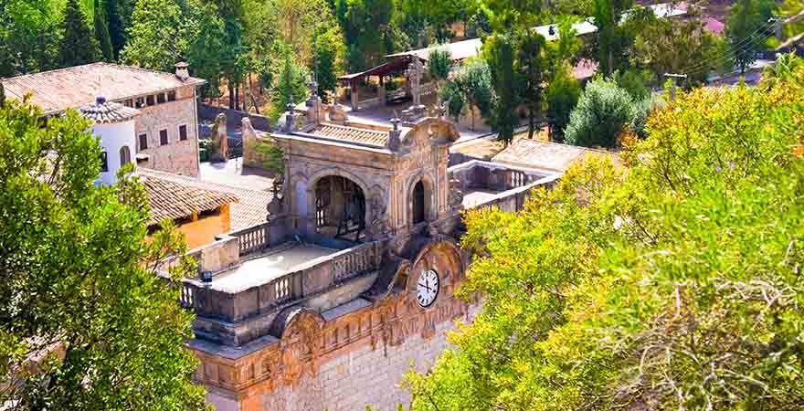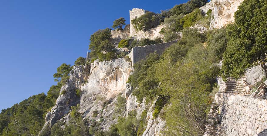 Weiter geht es zunächst zum Luxushotel L’Hermitage und von dort erst gemächlich, dann steil durch einen Steineichenwald nach oben zu einem Waldparkplatz, der bei den Mallorquinern für ein Wochenendpicknick sehr beliebt ist. Von diesem führt ein gepflasterter Weg die letzten Meter hinauf zur Ruine der Burg, die im 13. Jahrhundert Schauplatz eines erbitterten Erbstreits war. In der weitläufigen Anlage, die teils mit Steineichenwald überwuchert ist, erreicht ihr zunächst einen Aussichtspunkt zum Nachbarberg Soucadena. In die Burgruine hat man im 17. Jahrhundert ein Kloster gebaut, das aber inzwischen aufgegeben ist. Von diesem Kloster genießt ihr einen atemberaubenden Blick über die Insel bis zur Bucht von Palma. Zurück geht es dann über die Finca Es Verger.