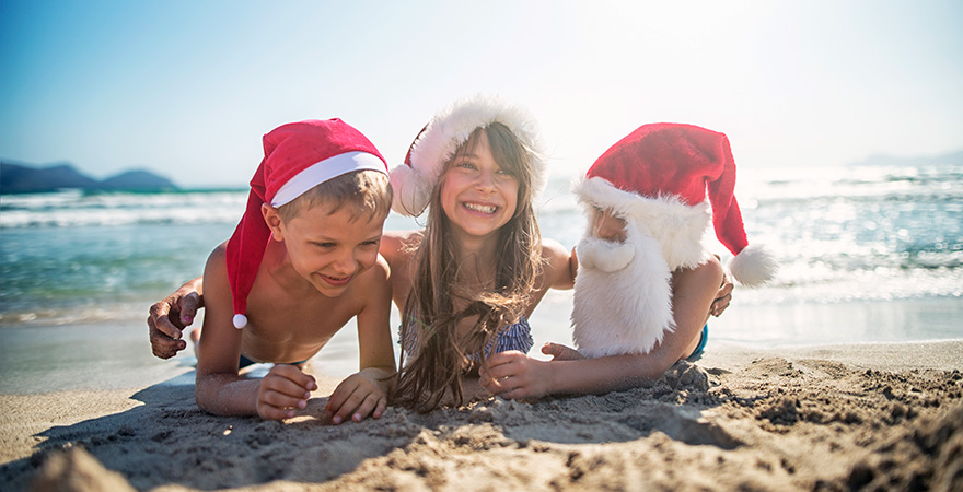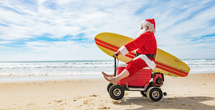 Während man sich hierzulande zu Weihnachten gerne zu Hause einkuschelt, zieht es die Menschen in wärmeren Gefilden spätestens nach der Bescherung nicht selten an den Strand. Vor allem die Australier sind dafür bekannt, die Feiertage mit Picknick und Barbecue am Strand zu verbringen und auch der Weihnachtsmann ist dort häufig mit Surfbrett und in Badehose anzutreffen. Doch auch in Florida, Kolumbien, Brasilien, Sri Lanka und auf Sizilien wird beispielsweise am Strand gefeiert.
