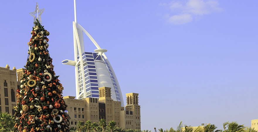 Obwohl in dem islamisch geprägten Emirat das Fest nicht offiziell gefeiert wird, ist es mit rund acht Sonnenstunden am Tag und warmen Temperaturen wie gemacht für außergewöhnliche Weihnachten am Strand. Opulente Weihnachtsdekorationen zieren das Stadtbild, auf der Resortanlage des Madinat Jumeirah und am Dubai Creek könnt ihr über den Weihnachtsmarkt schlendern, allerlei Köstlichkeiten genießen und bei künstlichen Schneeflocken den Weihnachtsmann treffen. Selbst Ski fahren und Eislaufen könnt ihr – der Skihalle „Ski Dubai“ und dem Dubai Ice Rink sei Dank. Auch kulturell kommt ihr bei einer Ballettvorführung oder einem Weihnachtskonzert in der Dubai Opera schnell in Weihnachtsstimmung.