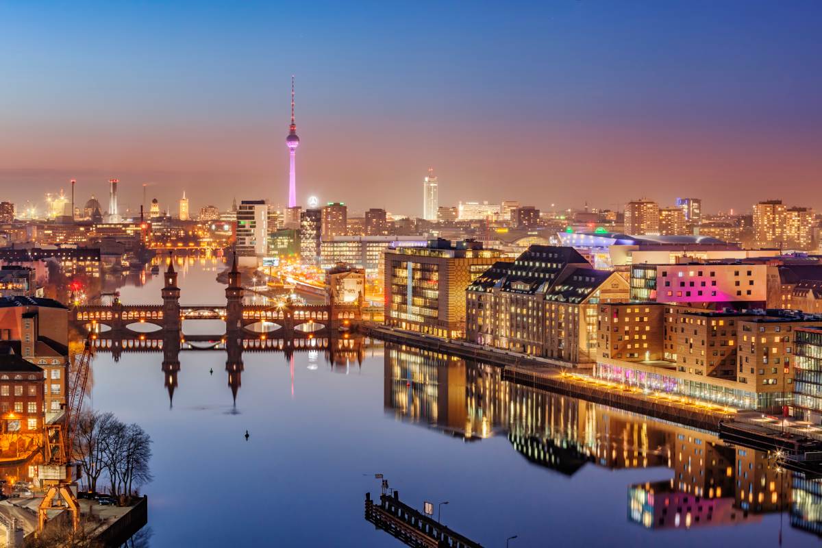 Beleuchtete Berliner Skyline am Abend mit Spree, Oberbaumbrücke und Fernsehturm.