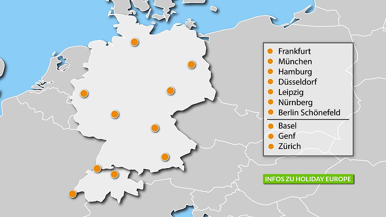 Infos zu den innerdeutschen Abflughäfen sowie der renommierten Airline Holiday Europe, welche Sie innerhalb von ca. 6 Stunden in die V.A.Emirate bringt.